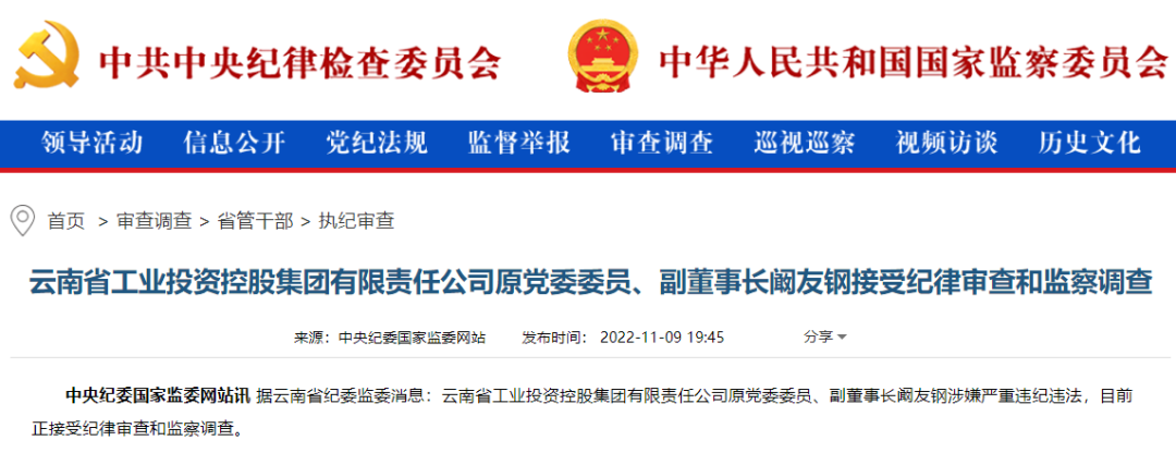 11月9日,中央纪委国家监委网站权威发布称,据云南省纪委监委消息:云南省工业投资控股集团有限责任公司原党委委员、副董事长阚友钢涉嫌严重违纪违法,目前正接受纪律审查和监察调查。