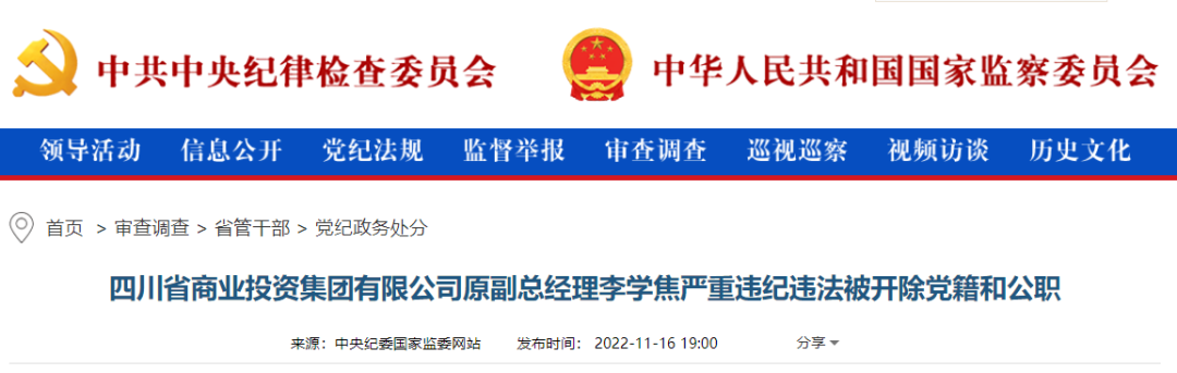 在11月16日中央纪委国家监委网站权威发布“四川省商业投资集团有限公司原副总经理李学焦被‘双开’”的信息里,有这样一句话:利用职务上的便利,为他人在项目承揽、资金拨付等方面谋取利益并收受财物,数额特别巨大。