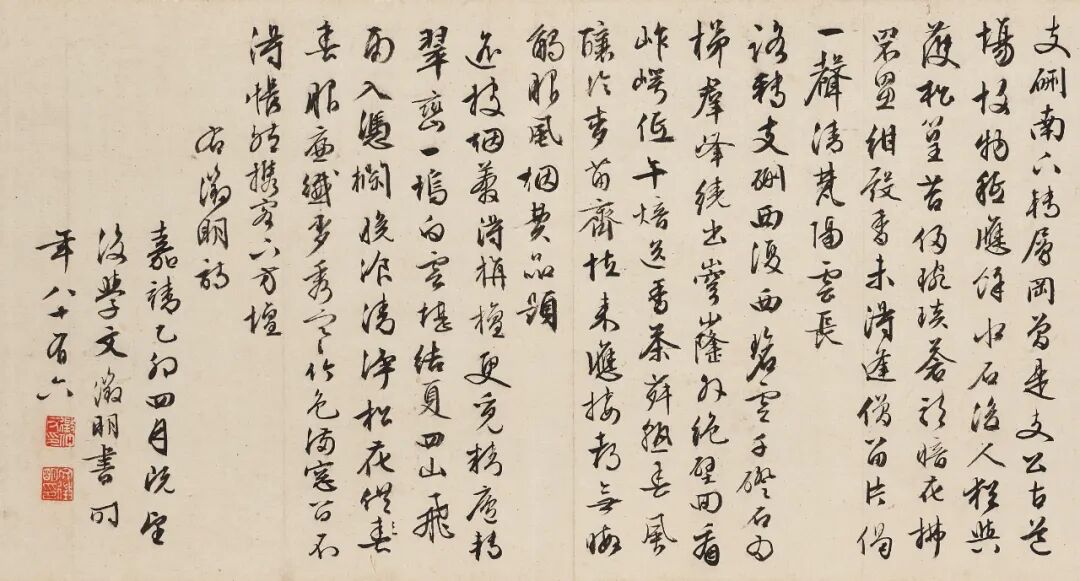 数十年后,86岁的文征明忆述当年老师沈周此卷 “画成作诗,未及书,为人持去”,思忆旧情,于是为之补录沈诗及自家诗作,兼述由来,遂使数十年来聚而复散,散而复见的《诗画合卷》,终成完璧。![]()