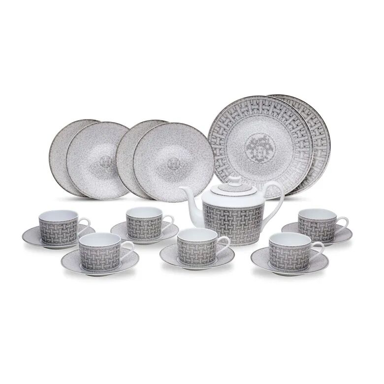金啡色SWIFT小牛皮奥德赛地球仪附黄铜配件,爱马仕,2010年代。估价:30,000-40,000港元。此拍品将于2020年7月10日佳士得香港“ 典雅传承: 手袋 及配饰”拍卖 呈献 爱马仕的灵感取材无处不在,这点在其马赛克系列餐瓷中可见一斑。1926年,位于巴黎福宝大道24号的爱马仕总店进行重新装潢,将装饰艺术风格融合古希腊式艺术,以马赛克图案瓷砖作装饰,当中再融入爱马仕标志性的马车图案和H字母。2009年推出的马赛克系列餐瓷系列,正是向此致敬,设计师Benoit Pierre Emery将当年的设计元素体现于餐具之上,传承了这项经典风格。