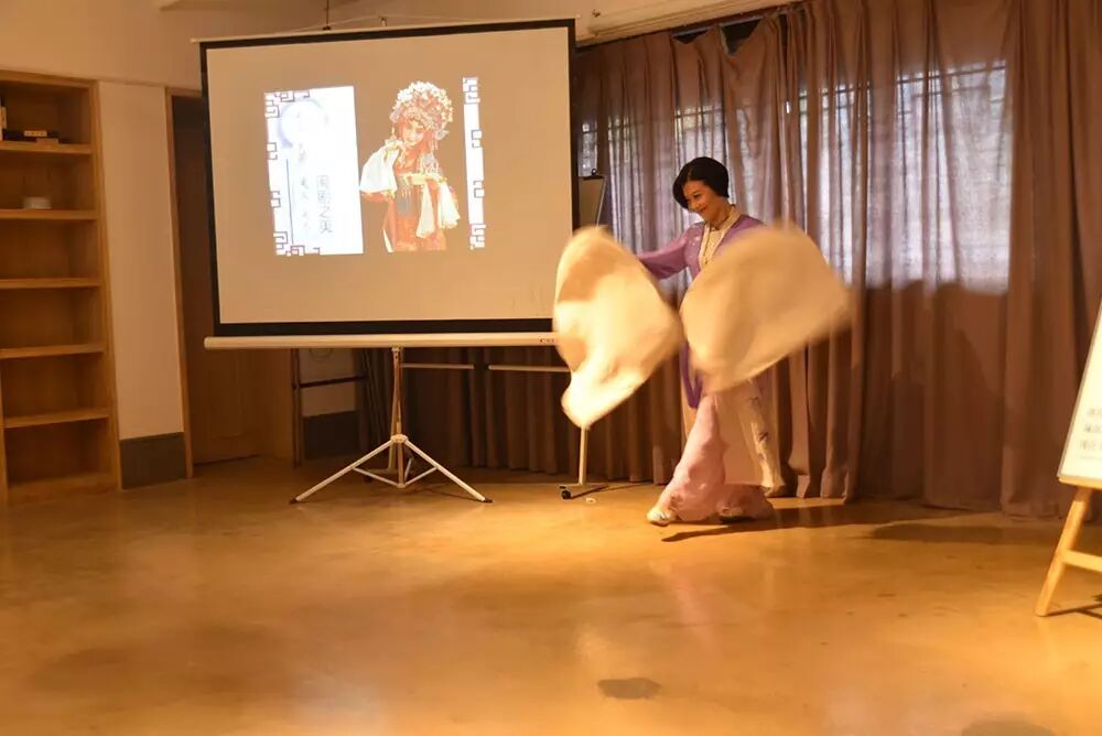林颖以一身白衣出现在现场,纱织的面料衬托着她秀气的神态。通过闽剧小知识的形式,她教大家如何去欣赏闽剧,首先,从“扮相之美”开始说起。扮相是闽剧演员上台前要着重准备的,可能仅仅是五分钟的表演,之前的扮相就得花两个小时左右的时间。通过扮相、服装表演手段等,加上人物年龄、身份、性格的不同,便区分出了戏曲里的各个“行当”。每个行当都有自己的表演程式,即戏曲表演中的一套规范。林颖现场展示了几种行当的程式,让大家直观感受其中的不同之处,通过不同力量的分寸感来区分小生、花旦与青衣。