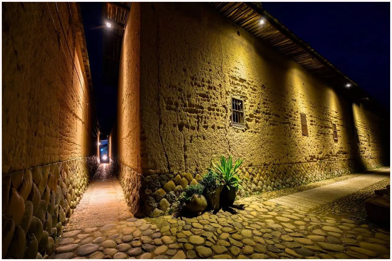 拔魁厝正门小广场设有石凳,坐下来歇歇脚,抬头可见老房子的墙面,在灯光投射下墙面肌理和纹路像极了层层叠叠的远山
