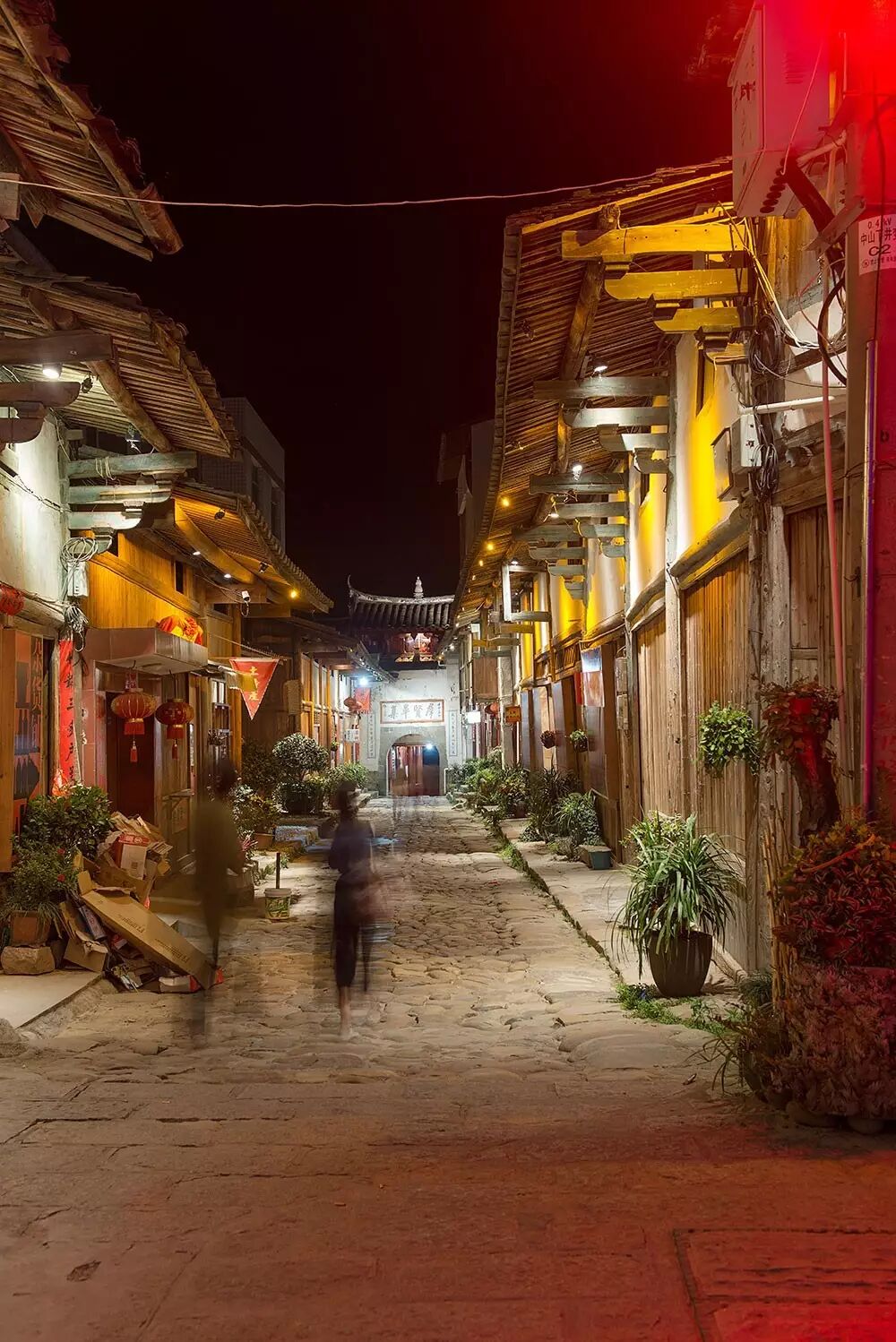 夜游嵩口,不需要看指示牌,灯光就是最好的导引。顺着灯光,我们从嵩口最具标志性的鹤形路走起