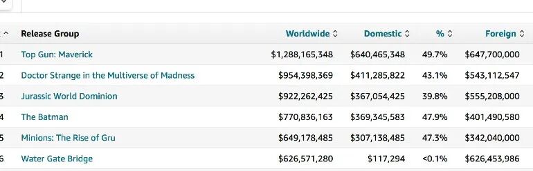 《壮志凌云2:独行侠》的票房超过了漫威超级英雄电影《奇异博士2》、《侏罗纪世界3》和由DC漫画改编的超级英雄电影《新蝙蝠侠》。目前该片在北美地区的票房达到了6.4亿美元。