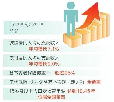 这十年,不只是生态环境,全省各项民生建设都有了长足的进步,329万贫困人口全部脱贫,连续多年财政支出八成以上用于民生,2013年到2021年,我省城镇居民人均可支配收入年均增长7.1%,农村居民人均可支配收入年均增长9.0%;基本养老保险覆盖率超过95%,工伤保险、失业保险基本实现法定人群全覆盖;15岁及以上人口受教育年限达到10.45年,位居全国第四;新冠肺炎疫情防控有力有效,社会保持安宁稳定。
