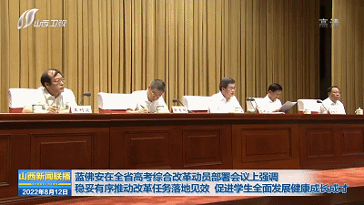 8月11日,全省高考综合改革动员部署会议在太原召开。省委副书记、省长、省高考综合改革工作领导小组组长蓝佛安出席并讲话。他强调,要深入学习贯彻习近平总书记关于教育的重要论述,认真落实党中央、国务院决策部署,以对人民对历史高度负责的态度,稳妥有序推动改革任务落地见效,促进学生全面发展健康成长成才,以实际行动和优异成绩迎接党的二十大胜利召开。省委副书记、领导小组第一副组长商黎光主持。副省长、领导小组副组长张复明通报有关情况。