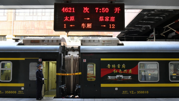 早上7时50分,4621次“蔡家崖号”红色文化列车缓缓驶离太原火车站,开往革命老区吕梁兴县蔡家崖。记者注意到,车厢外,晋绥边区革命纪念馆的图案和“蔡家崖红色文化列车”几个大字格外醒目。车厢内,走廊都打造成“英雄吕梁”摄影长廊,展示着一幅幅吕梁红色景点、自然风光摄影作品。在3号车厢,还设置了红色读物书架,供旅客阅读。