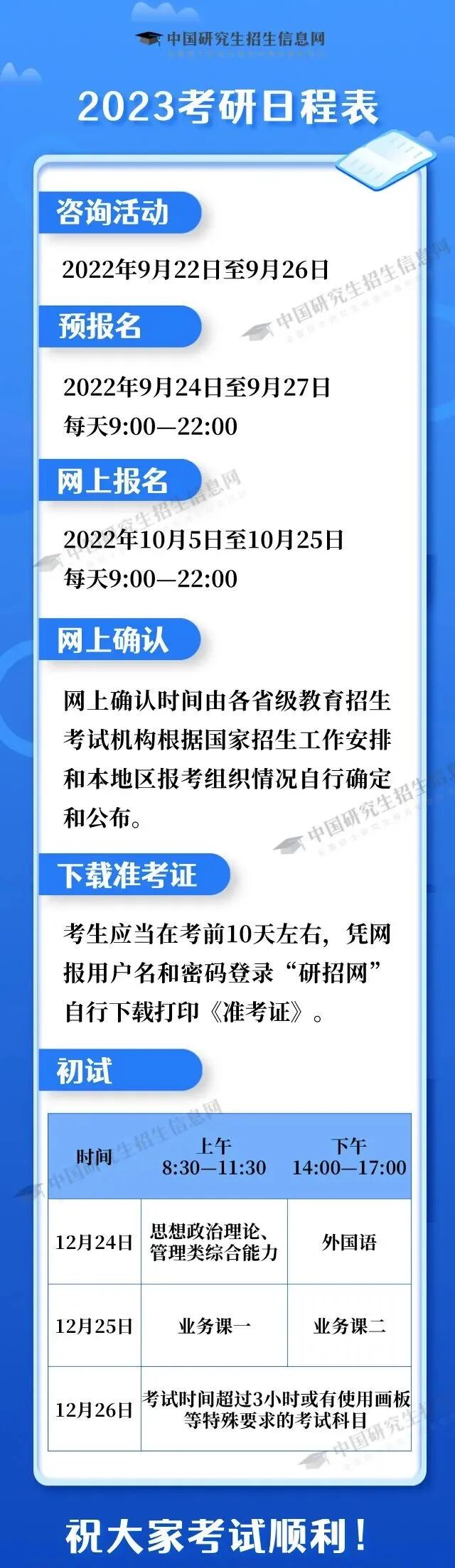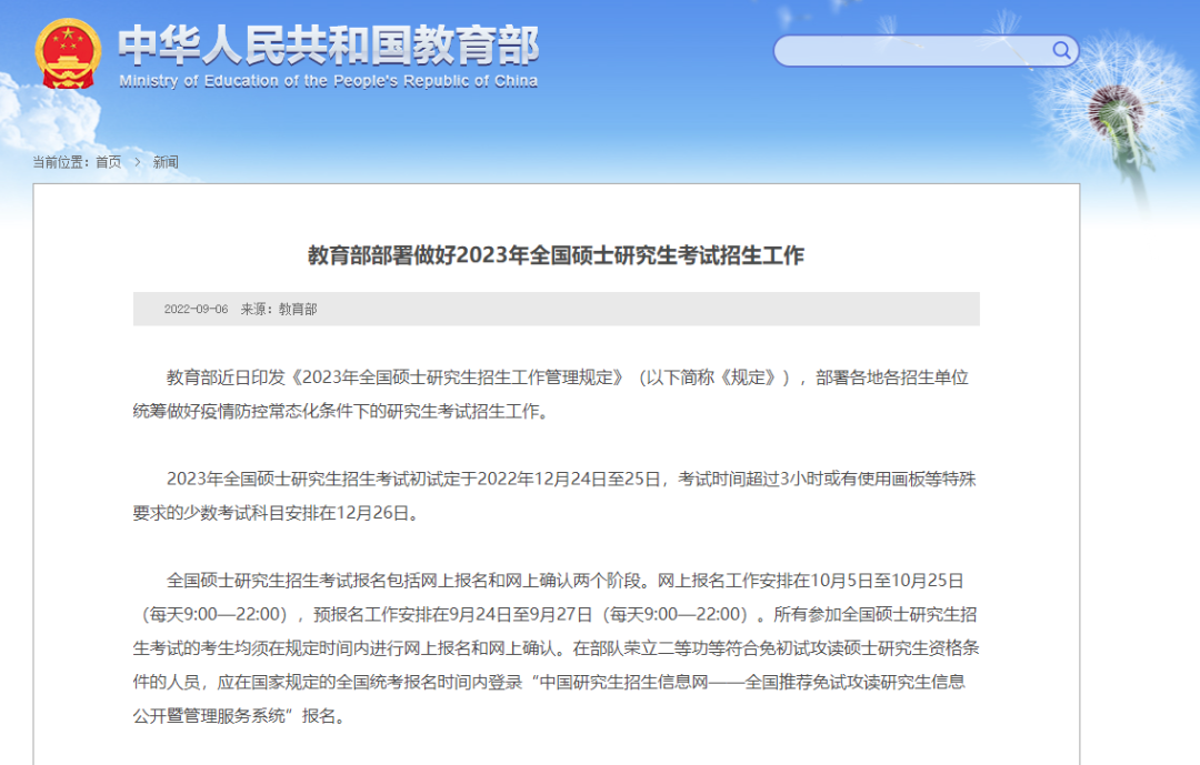 2023年全国硕士研究生招生考试初试定于2022年12月24日至25日,考试时间超过3小时或有使用画板等特殊要求的少数考试科目安排在12月26日。