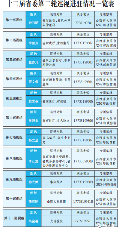 据悉,巡视期间设有专门联系电话、巡视意见箱和专用邮政信箱。巡视组受理电话的时间为工作日上午08:00—12:00,下午15:00—18:00。根据巡视工作条例规定,省委巡视组主要受理反映被巡视党组织领导班子及其成员、下一级党组织领导班子主要负责人和重要岗位领导干部问题的来信来电来访,重点是关于违反党的纪律、涉嫌职务违法犯罪等方面的问题反映。其他不属于巡视受理范围的问题反映,将按规定由被巡视党组织和有关部门认真处理。