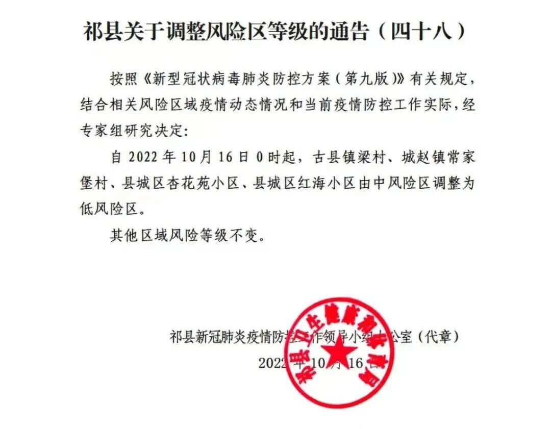 10月16日15时,经市县疾控专家共同分析研判,对照国务院联防联控综合组下发的《关于印发新型冠状病毒肺炎防控方案(第九版)》,全市共设定高风险区42个,中风险区6个,具体如下:西至魏都大道、北至安益前街、东至武定北路、南至操场城街所围区域(不包括云顶雅园、建馨园)纳入如下区域:南至操场城街、东至北苑路和站东大街、西至西苑路和北环路、北面和东北面至铁路线的合围区域(不包括其中已划定的高风险区、大同火车站及站前广场),仍按中风险区管理。圣雅大厦及附近小饭店;凯鸽火锅御东店;龙聚祥西京店;欣惠妈咪美容院(御东皇冠酒店西);向阳里柳港园社区卫生服务站及附近米线店;平城区建馨园小区及附近商超;平城中学;西至御河西路、北至南环路、东至滨河路、南至御河十号小区南沿所围的区域;观澜华府小区(南区和北区);碧水云天御河湾小区;云顶雅园小区(包括启明国学幼儿园);新华街东西大院;星茂汇-百盛购物中心及周边商超;大同大学附小(龙园校区);五洲帝景青年城C区;杨园北区;柳港园B区;永昌小区;富力城4期;东信国际(昌宁街以南);宏洋美都小区;前进新苑(一期);开源嘉苑西区;桐城怡景西苑;凤凰翰林别院小区;同和苑小区;同煤新苑A区;玫瑰花都小区;北辰花园小区;新华街局前小区;太阳城一期和二期;大秦佳苑小区;文慧东苑;物兴园小区;美好家园小区;金水湾小区;正德嘉苑小区;星港城小区;云海苑小区。都挺好火盆烧烤店;东海浴园;锦华家园小区;镜湖园小区;魏都新城D区;南至操场城街、东至北苑路和站东大街、西至西苑路和北环路、北面和东北面至铁路线的合围区域(不包括其中已划定的高风险区、大同火车站及站前广场)。![]()