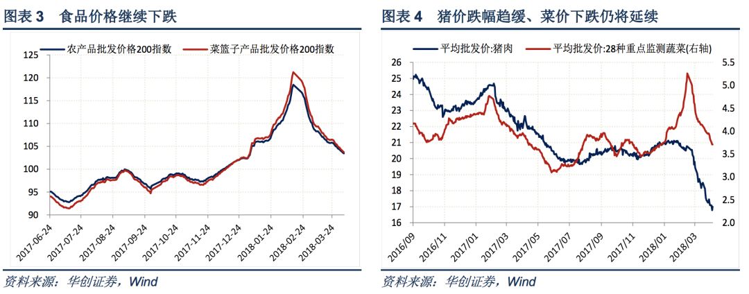 截至4月4日,农产品批发价格200指数收于103.45,环比下降0.91%,菜篮子产品批发价格200指数收于103.72,环比下降1.06%(图表3),食品价格持续下跌。从细项数据来看,截至4月4日,上周猪肉价格环比下跌0.58%;蔬菜价格环比降幅达3.13%(图表4)。节后猪肉价格进入快速下跌通道后,上周跌幅有所收窄,可能与清明假期消费需求小幅增加有关。但近期来看,影响前期猪肉价格下跌的因素并没有实质改变,猪肉供给充足,气温持续回升猪肉消费需求持续走低,除“五一”等节假日期间能小幅提振猪价外,预计猪肉价格仍将维持低迷。上周蔬菜价格仍维持下跌,虽然前期蔬菜价格持续走低,但从季节性规律来看,随着气温的回升和供应的增加,蔬菜价格在上半年仍将大概率维持下行的走势。