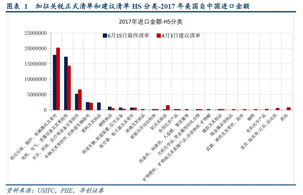 结构上关税清单高度集中于“重大工业技术”商品。从行业分布来看,无论是建议清单的1333种商品还是6月15日公布的1102种商品的最终关税清单,从HS分类法来看,均主要集中在机电产品、仪器设备和运输设备(HS分类中前四项占比达到91.1%)。6月15日白宫声明中也明确指出,500亿美元商品清单主要为含有“重大工业技术”的商品,包括航空航天、信息和通信技术、机器人、工业机械、新材料和汽车等行业。从行业占比来看,受影响最大的是航空器、航天器及其零件,占该类产品出口全部金额的13.85%,光学、照相和医疗设备及零附件出口受影响程度也较高,占出口比重达到7.12%。