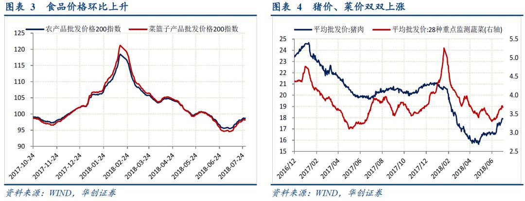 上周农产品批发价格200指数收于98.67,环比上升0.56%,菜篮子产品批发价格200指数收于98.21,环比上升0.64%(图表3)。细项数据看,上周猪肉价格环比上升1.47%,蔬菜价格环比上升1.38%(图表4)。上周由于台风的影响,全国范围内出现高温暴雨天气,加之夏季口味清淡,是蔬菜消费旺季,上周蔬菜价格上涨。预计短期内将延续供给减少、需求平稳的格局,菜价将延续季节性上涨走势。虽然处于猪肉消费淡季,夏季生猪生长速度缓慢,将对猪肉价格形成支撑。再加上近期台风降雨天气也会对生猪调运产生影响,预计短期内猪肉价格延续震荡上涨。