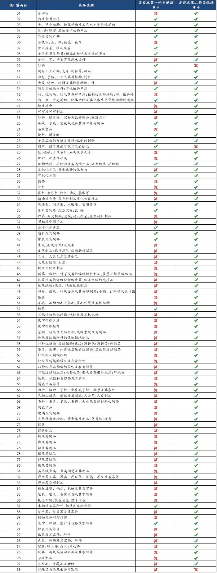 相比于第一轮关税清单“集中火力、重点打击”,第二轮关税清单打击面大幅增加。尽管第二轮关税清单金额仅仅比第一轮高出100亿美元,但商品数目从第一轮的659种骤升至5209种。如果按照关税清单涉及的商品类别(对应HS编码前两位)来看,第一轮关税清单仅包含谷物、蔬菜、水产品、塑料和橡胶制品等25种类别的商品,并且主要以初级产品为主,机电产品、机械设备等几乎未涉及。梳理第二轮关税清单来看,98类商品中除了谷物和烟草已经被纳入第一轮关税清单的商品没有涉及之外,所有类别商品均被纳入其中,打击面大大增加,几乎无一幸免。