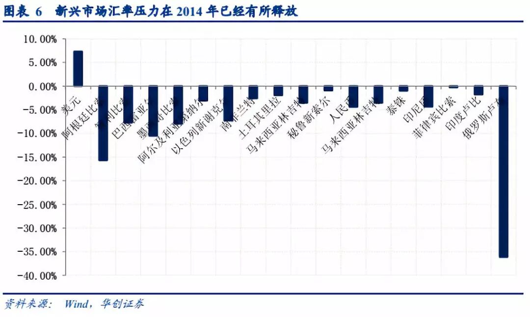 另外,新兴市场汇率贬值压力在2014年已经有所释放。美元指数在2014年上涨了近10%, 新兴市场货币普遍贬值,俄罗斯(最大贬值36.13%)、巴西(最大贬值10.49%)、阿根廷(最大贬值15.67%)等货币最大贬值幅度超过10%。