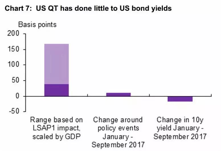 考虑到QE1的巨大影响,当美国开始QT的时候,市场预期这将导致债券收益率大幅上升,尤其是在美国政府也开始抛售更多债务之际。可以通过估算未来三年联储资产负债表规模可能下降的平均水平,乘以第一轮QE时每一美元资产购买带来的美国国债收益率的变化来估测QT对国债收益率的影响。然后实际结果却截然不同。尽管在去年的前9个月里有各种各样的QT公告,收益率实际上在这段时间内下降了。