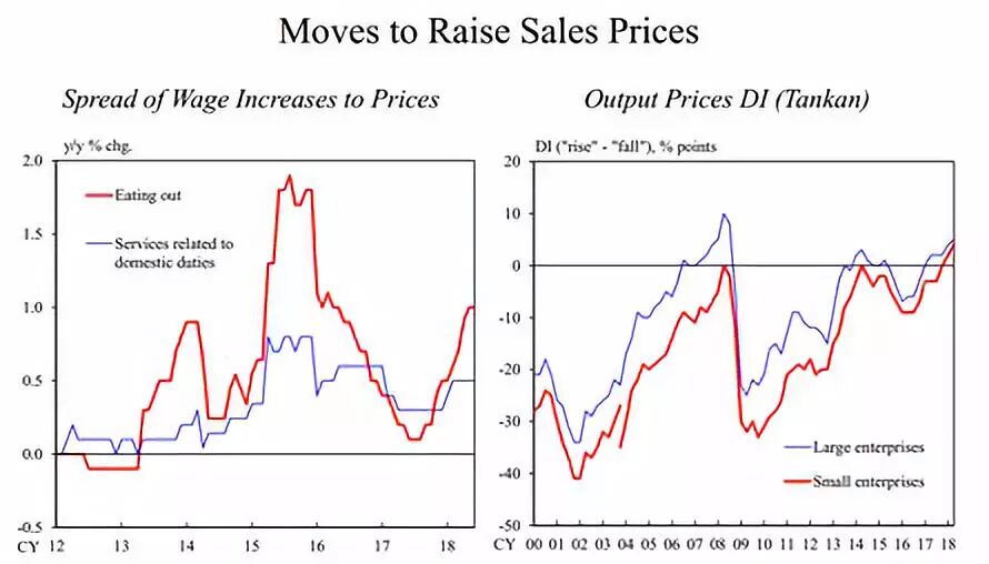 当前出现的一些变化指向经济和就业状况在持续改善。例如,提高售价的现象变动更加广泛,主要是在服务行业,如外出就餐。此外,根据银行的短观调查,提高产品价格的企业数量已经超过降价企业数量有一段时间了。随着所谓的婴儿潮一代达到70岁,劳动力市场的状况可能会进一步收紧,主要兼职员工的工资增长速度预计将会加快。随着工资上涨的影响扩大到普通员工,这将导致家庭对物价上涨的容忍度提高。当这种情况发生时,公司的价格上涨也将更容易被接受。