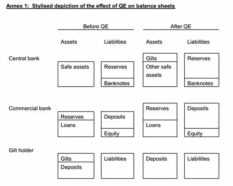 后来的QE以及早期的QT产生的影响较小,更重要的原因可能是,与量化宽松实际运作的各种方式有关。我们需要回过头来研究政策的机制到底是什么。量化宽松有时被描述为“印钞”,这可能是一种误导。实际情况是这样的:中央银行在公开市场上购买主要来自非银的政府债券。假如英国央行是用支票支付,则英国国债的卖家将支票存放在自己的商业银行,增加了其存款的规模,那个商业银行反过来又把支票存在央行,增加了它在中央银行的存款,也就是所谓的储备金。这对各方的净财务状况都没有直接影响。债券卖家在其银行账户中获得了更多的现金,但其总资产却没有变化。而商业银行与中央银行,最终拥有更大的资产负债表。