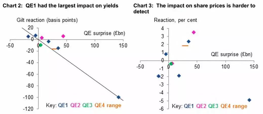 那么为什么它在实践中对债券收益率有明显的影响?这通常有三方面的渠道,“银行贷款”渠道强调了银行流动资产的重要性,以及缺乏准备金可能对其行为造成的限制,包括它们的放贷意愿。在2008-09年金融危机之后,“投资组合平衡”渠道普遍认为是更加重要的,这强调了央行购买资产的直接价格效应。第三个是“潜在”的信号效应,特别是QE释放的央行未来政策的意图,尤其是官方利率的可能路径。