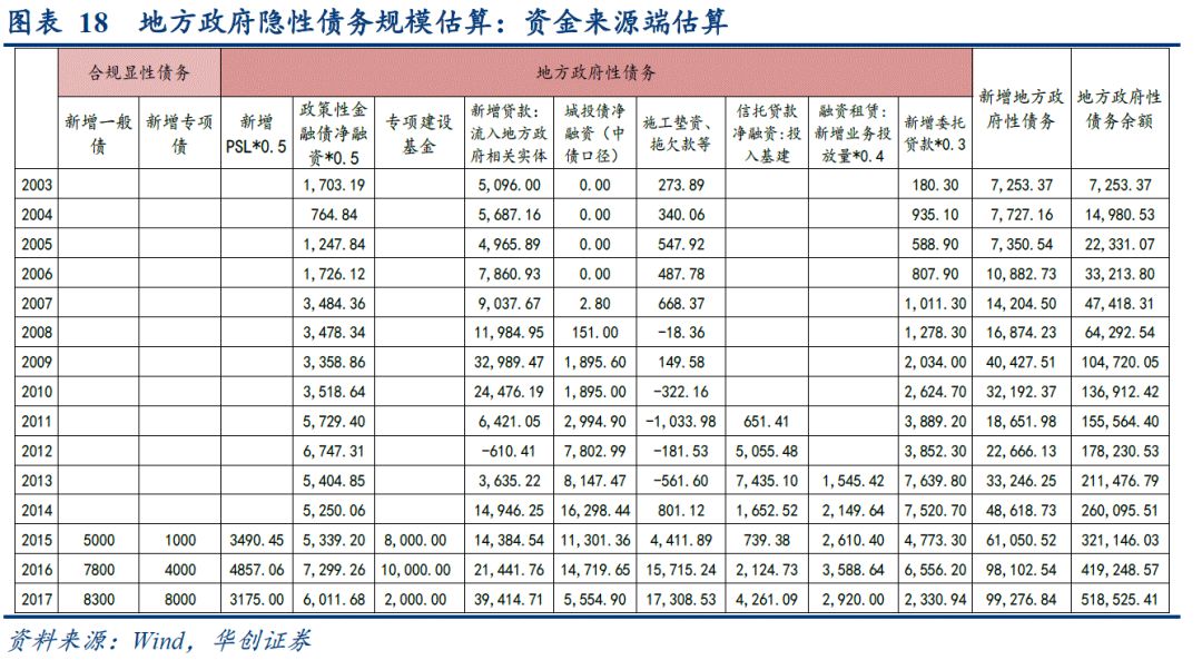 从资金来源端,估算近年来银行信贷、非标(主要是信托和委托贷款)、债券和融资租赁投向政信类项目的资金规模,资金来源端估算地方政府隐性债务规模在22.4万亿。