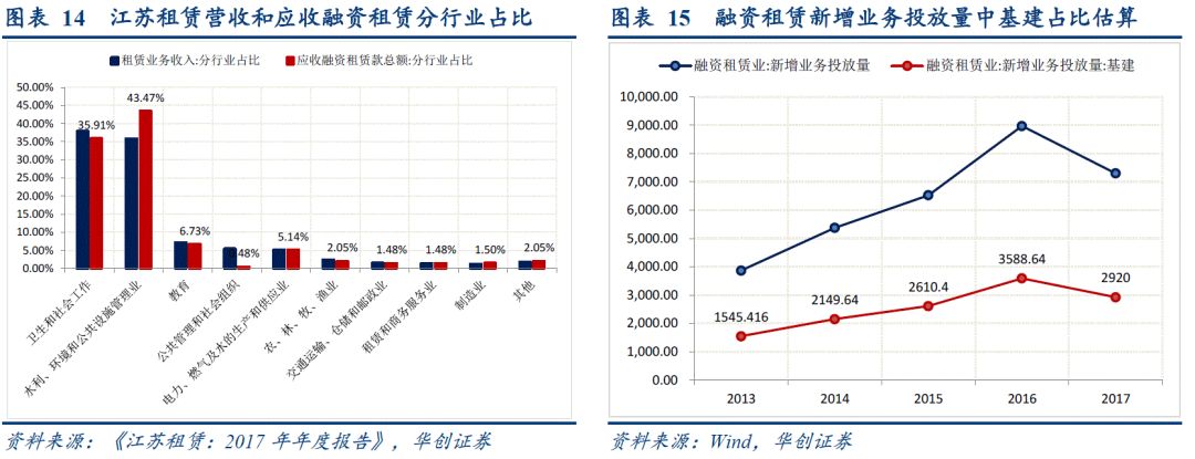 4、融资租赁。融资租赁自2010 年开始快速崛起,2010 年新增融资租赁公司60 家,较前一年实现翻倍增长,融资租赁成为地方政府变相举债方式。融资租赁2017 年新增业务投放金额达到7300 亿元,但如何估算其投入地方政府的比例?一方面,参照新增信托贷款中40%左右投入基建;另一方面,根据江苏租赁2017 年年报显示,租赁业务收入和应收融资租赁中基建相关行业占比在42%-50%左右。综合以上,我们以40%的比例估算新增融资租赁投向地方政府相关主体的比例。