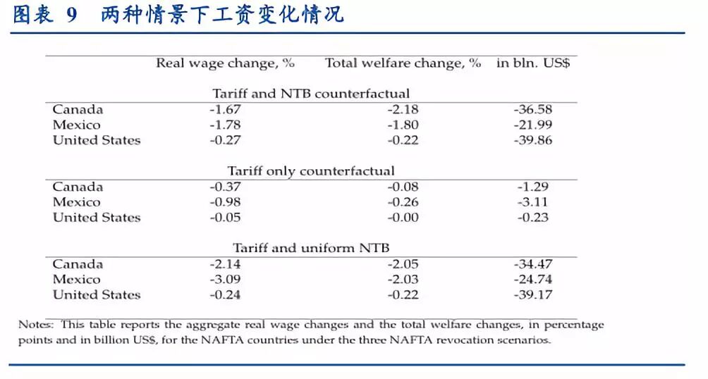 模拟结果表明,相比部分撤销北美贸易协定(情景二),完全撤销(情景一)对美国、加拿大、墨西哥带来的损失更大。在国家层面进行评估:在情景一中,设定完全撤销北美自由贸易协定,总福利变化(相当于每年实际国内生产总值的下降)美国为0.22%,墨西哥为1.8%,加拿大为2.2%。从绝对值来看,完全撤销北美自由贸易区,美国的年度损失约为400亿美元,加拿大损失370亿美元,墨西哥损失220亿美元。在情景二中(部分撤销北美贸易协定),即关税增加但非关税壁垒保持在目前水平,总福利变化美国为0.05%,墨西哥为0.98%,加拿大为0.37%(按绝对值计算,分别为0.23美元,3.1和13亿美元),远小于情景一对经济的影响。
