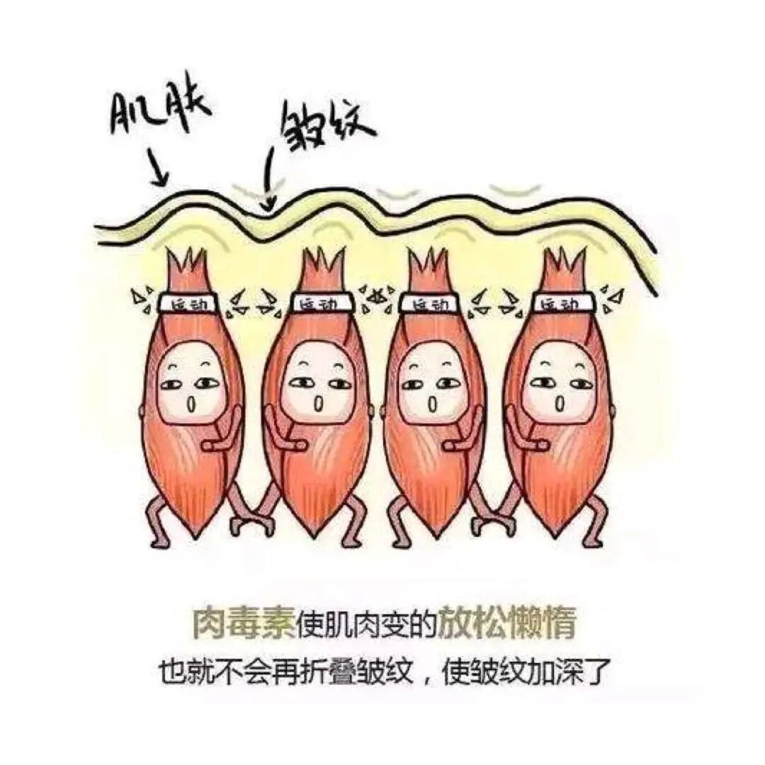 肉毒素的全名是肉毒杆菌,是一种天然纯化蛋白、神经毒素,它在注射之后能够阻断神经肌肉传导,使原本松弛的肌肉出现持续性麻痹,进而抑制肌肉收缩,最终达到除去皱纹的目的。