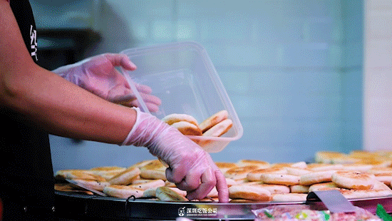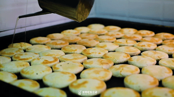 老板说,店里用的绿豆都是从家乡惠来运过来的,吃起来会更清甜,每天基本都要100多斤的绿豆才够用。绿豆饼会在家里做好再带到铺头烤,翻面时间还要严格把控,不然很容易焦掉,好在老板已经是十几年烤饼熟练工了,一次做60个都是湿湿碎。