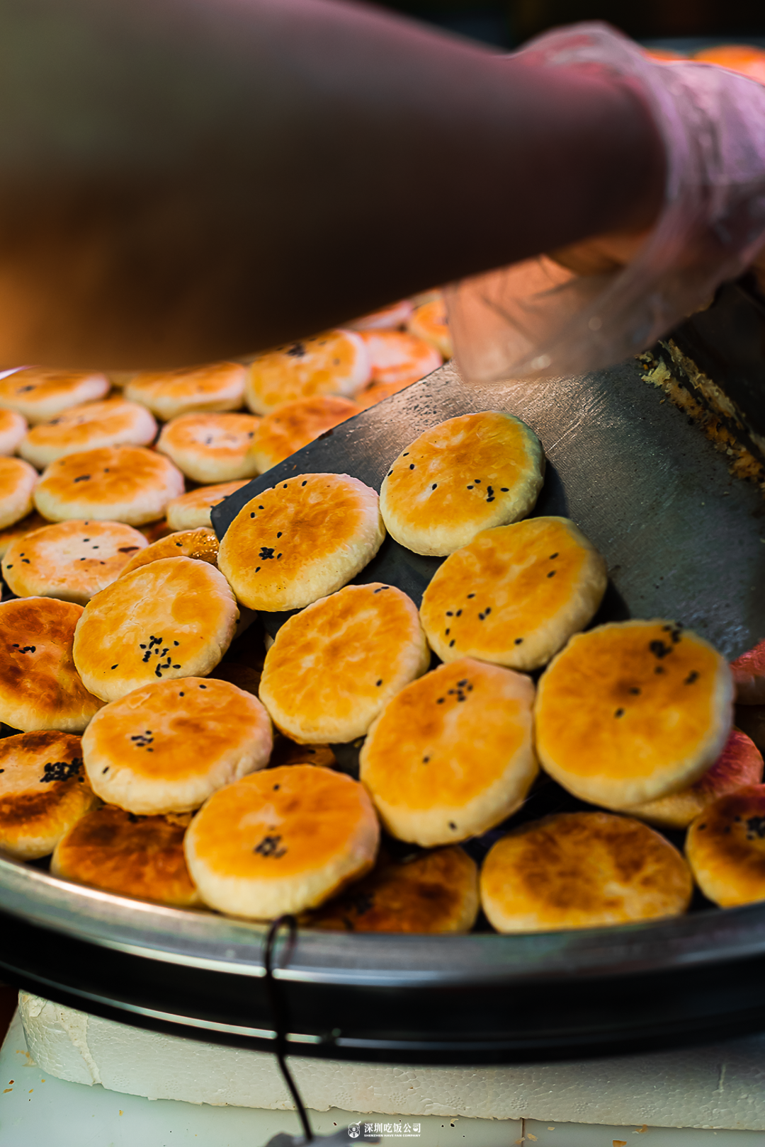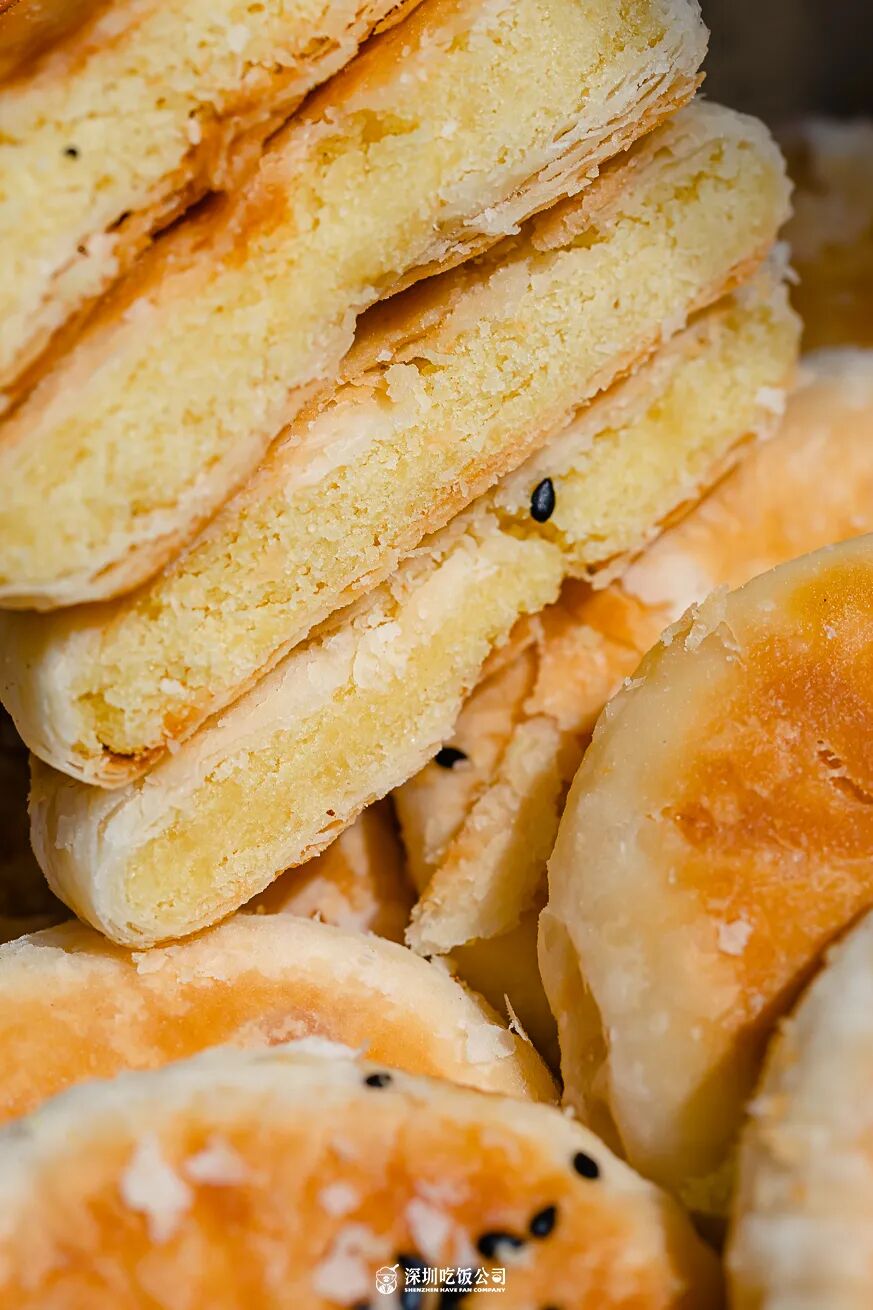刚烤好的饼需要及时摊开晾凉,吃的时候才会香酥松散。阿饭拿到手的时候饼身还带有余温,饼皮上点缀着些许的黑芝麻,轻轻一捏就酥到掉渣渣。