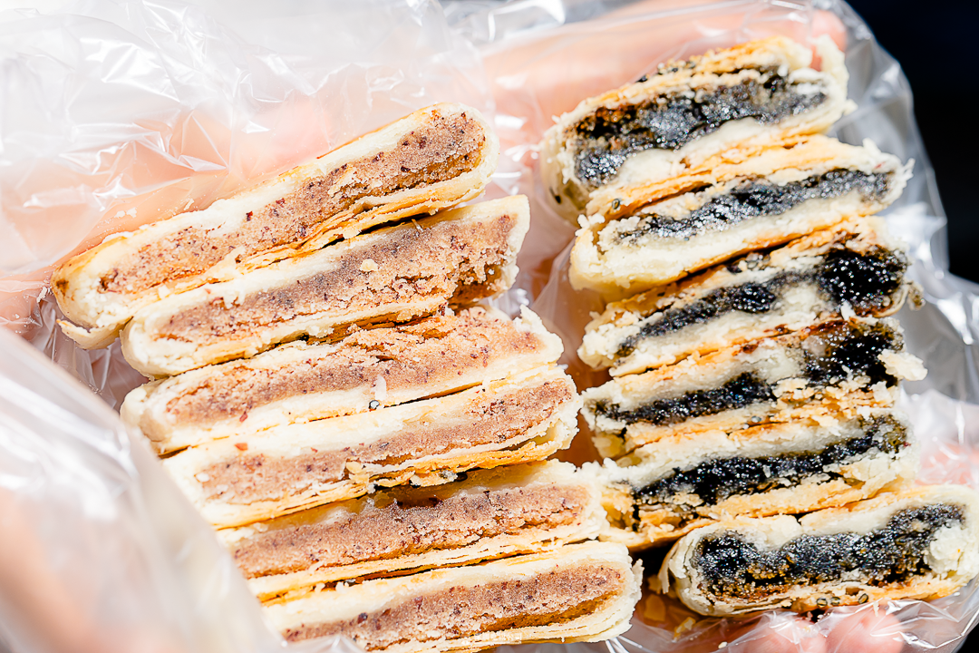 不喜欢绿豆的,这里还有红豆饼和芝麻饼,1.5元/个。芝麻饼里面另外加了糖冬瓜,口感上会更为扎实,而红豆饼则是咸甜口的。虽然人气不如绿豆饼,但它俩也有自己的粉丝。