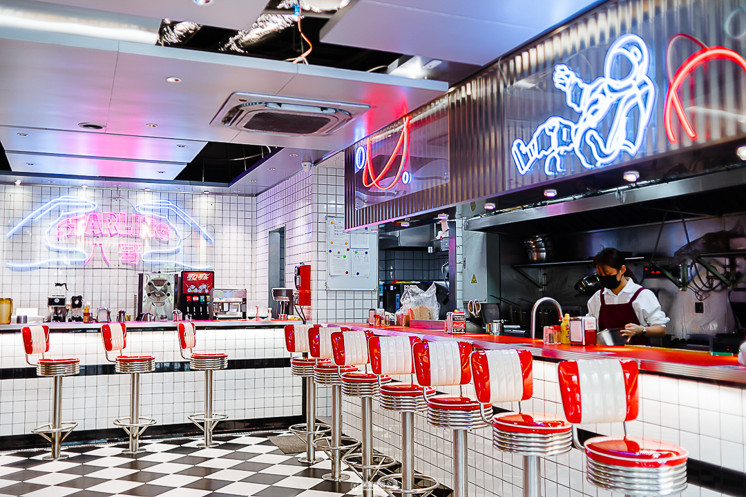 八哥是一家美式汉堡茶餐厅,他们的汉堡是用软面包胚,入口口感会比较湿润,和煎至微焦的牛肉饼形成反差口感,一松软一焦脆。里面有洋葱粒盒酸黄瓜,同样是解腻能手。走进店里,满眼都是霓虹灯、棋盘格还有大面积的红白色块,很有80年代的复古味道。