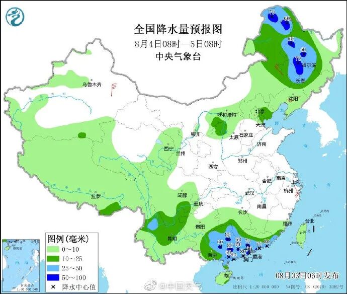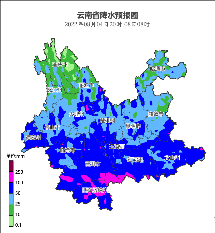 8月4日夜间-5日:文山东部、丽江南部、大理东部、楚雄西部、普洱东部、西双版纳东部、玉溪西部、红河南部有中到大雨局部暴雨。