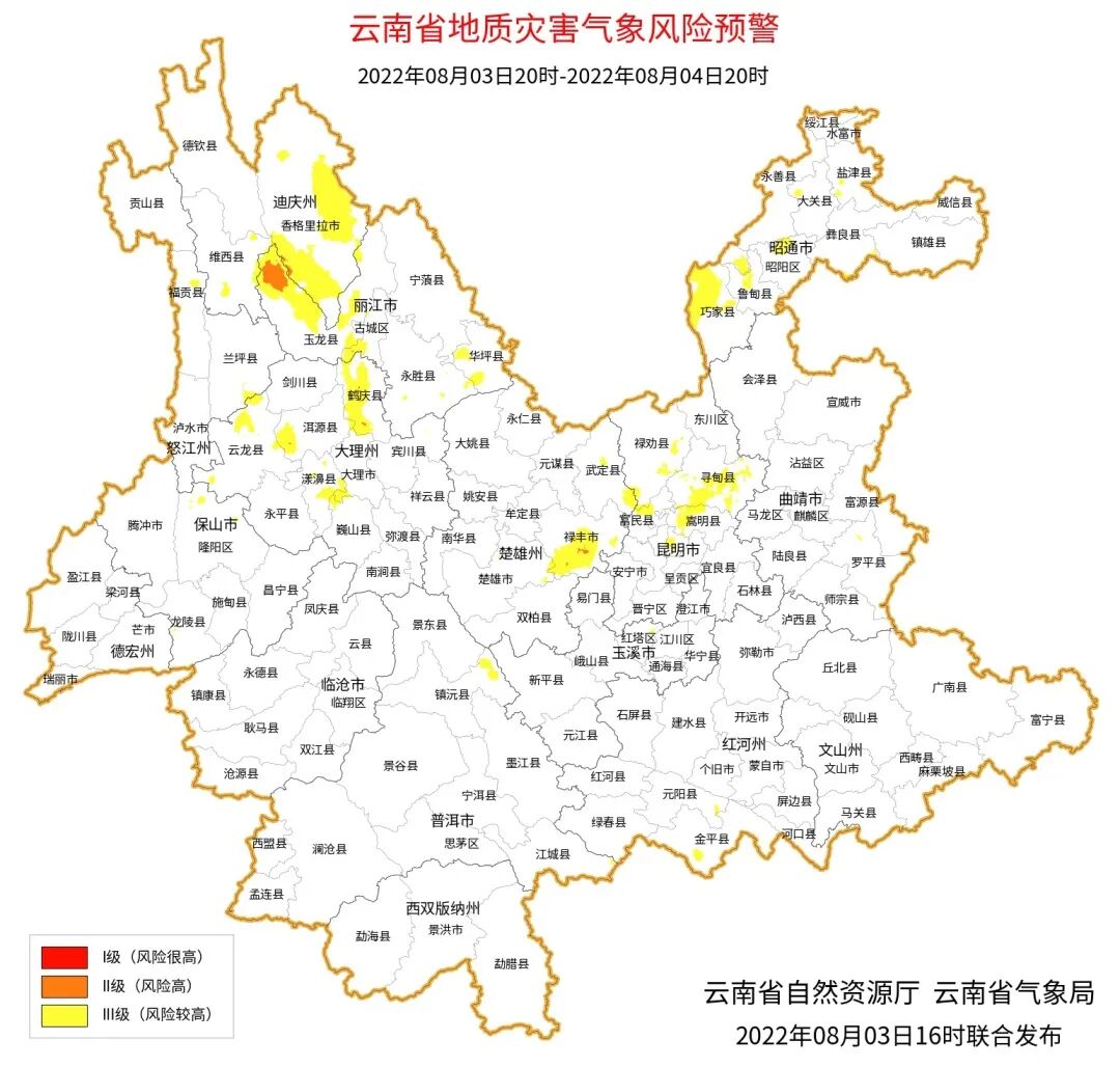 2022年08月03日20:00~08月04日20:00,迪庆州南部,丽江市西北部,大理州北部、西部,楚雄州东部局部区域发生滑坡泥石流的风险较高;曲靖市东部,昭通市中部、北部,迪庆州东部、中部,丽江市西北部、中部、东部,怒江州中部,大理州西部、北部、南部,保山市西北部,普洱市北部,红河州南部,楚雄州东部、东北部,昆明市北部局部区域发生滑坡泥石流的风险较高。