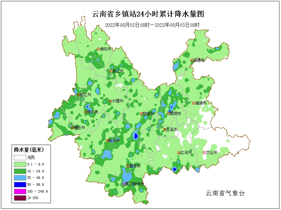 8月7日:保山西部、德宏、临沧、普洱南部、西双版纳、红河南部有中到大雨局部暴雨。