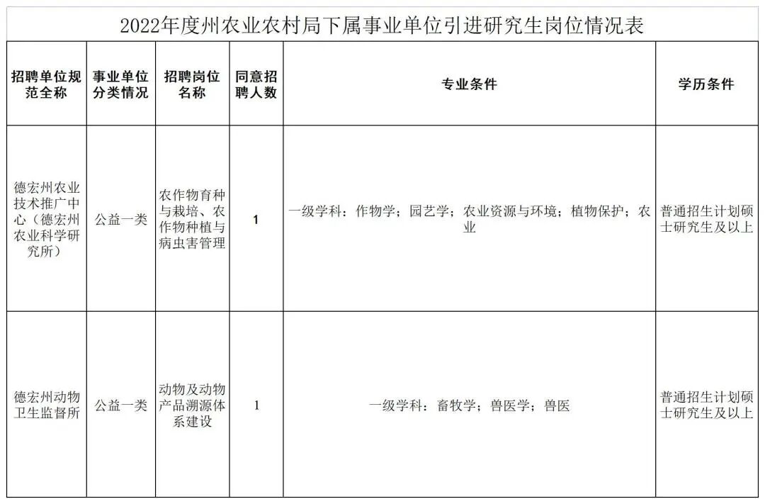 德宏州农业农村局直属事业单位2022年度公开引进硕士研究生通告