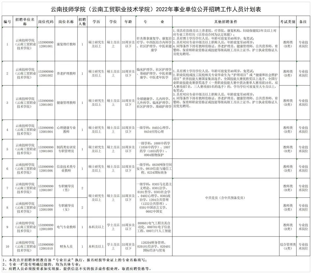 云南技师学院(云南工贸职业技术学院)2022年公开招聘事业单位工作人员公告