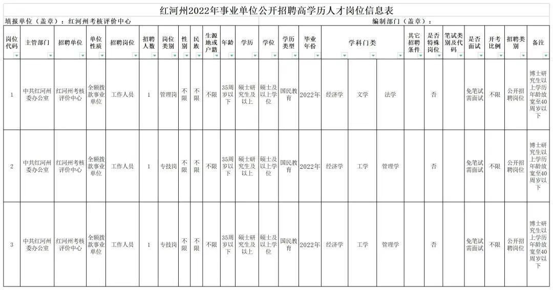 红河州考核评价中心2022年事业单位公开招聘高学历人才公告