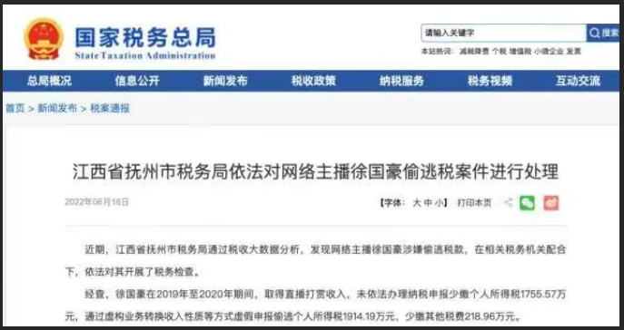 光明日报记者从国家税务总局抚州市税务局获悉,近期,江西省抚州市税务局通过税收大数据分析,发现网络主播徐国豪(陌陌号:徐泽)涉嫌偷逃税款,在相关税务机关配合下,依法对其开展了税务检查。