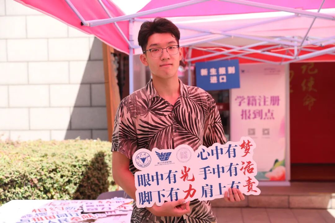 8月18日,来自安徽的陈天缘收拾好行囊,带上那张陪伴了他多年的明信片,从家来到求是园。在入学报到时,看着那块刻着“竺老两问”的巨石,眼前的场景逐渐与明信片中日思夜想的风景重合,陈天缘内心激荡不已。