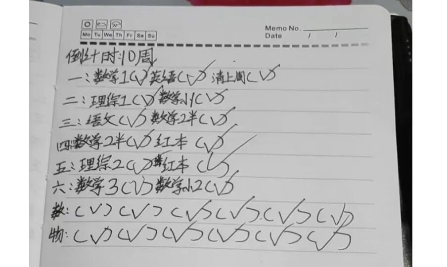 陈天缘有一个笔记本,他给自己制定了每日目标,每天看一看笔记本,把每日计划本上最后一项用笔划去。