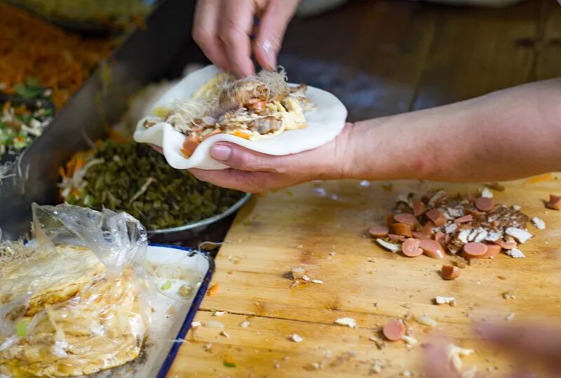 土家族的阿哥阿妹到了腊月末忙着打糍粑来准备年货。冬月寒,糍粑暖,糯米蒸熟后用碓(duì)舂,或用杵、槌砸打成泥状,再捏成团、压成饼就做成糍粑了;糍粑的口味也是各不相同,原料有混玉米碴、野菜的;馅料有芝麻、咸菜的;烹饪方法有油炸或者用芭蕉叶子包裹蒸熟的。