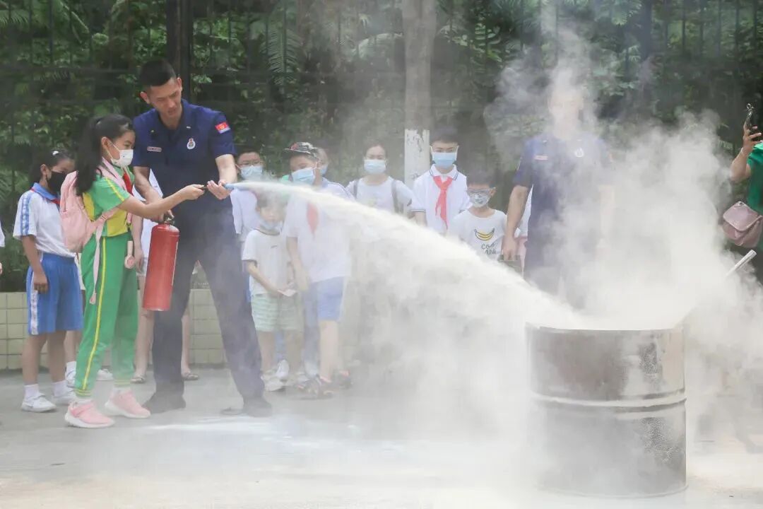 “这就是我们救火时穿的消防服。”消防员拿起了一件上下一体、内含多层的藏蓝色衣服,看起来十分厚重。同学们都对消防服的“魔法”兴致高涨,纷纷试穿消防服,戴好消防帽,全副武装感受消防服内的世界。高温天气下,哪怕只穿了一小会,同学们的额头、脖颈都冒出了点点汗珠,纷纷说道:“太热了!消防员真的太不容易了!”华南师范大学历史文化学院团委励耘服务队结对省级青年文明号——广州市黄埔区萝岗消防救援站来到广州市番禺区开启一场有“知”有“味”的沉浸式消防研学之旅,来自广东番禺中学附属学校、番禺区名智小学30多组亲子家庭共60余人到现场参与活动。同时,活动对湛江遂溪平衡学校的小学生开展全程线上直播。研学活动通过现场实操灭火工具,真实使用灭火器、水枪进行灭火。进入“火场模拟逃生体验充气囊”,实打实地模拟了火灾现场的情景,“逃出生天”的同学们,气喘吁吁地说道“太刺激了!”“还要再试一次!”实地体验带来的是弥足珍贵的领悟,从模拟的火场逃生之后,不少同学都大喊“再也不乱玩火了”。通过研学活动,同学们切身感受到消防队员们勇担使命,守护万家安康的决心与力量。![]()