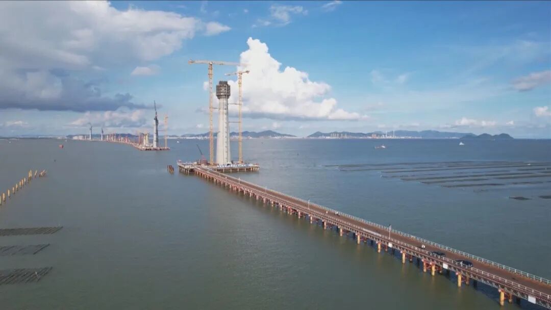 黄茅海跨海通道作为港珠澳大桥的西延线,全长是31公里,其中海域部分是14公里,目前各项工作开展都很顺利、稳步推进。本项目技术难度最高,然后工期也是最紧的,就是我身后的黄茅海大桥的中塔,它从去年的下半年做完桩基之后就开始逐步地露出水面了。
