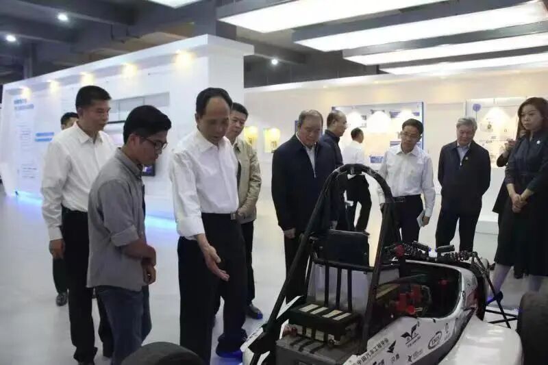 ▲全国人大副委员长吉炳轩莅临学校创客空间调研对学生赛车作品予以肯定