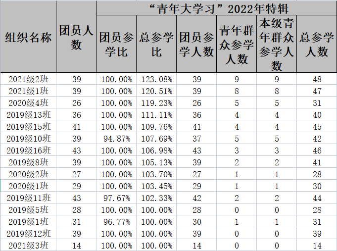 学习新思想,争做新青年。学习青年大学习,让青年进行学习,提高思想素质,热爱自己的国家,关心国家大事,争取为了国家繁荣富强而努力奋斗。学习是永无止境的,特别是趁青春年少时。2020级汉语国际教育4班团支部,在该校传媒学院“青年大学习”2022年特辑中,团员参学比100.00%,团员参学人数26人,青年群众参学人数5人,总参学人数31人。![]()