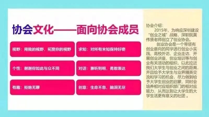 深圳是创业之都,创业协会致力于深职院学子创新创业能力培养,让一群充满想象力和创造力的年轻人汇聚在一起,开拓创新思维,开展创新创业交流与实践,一起学习,一起成长。