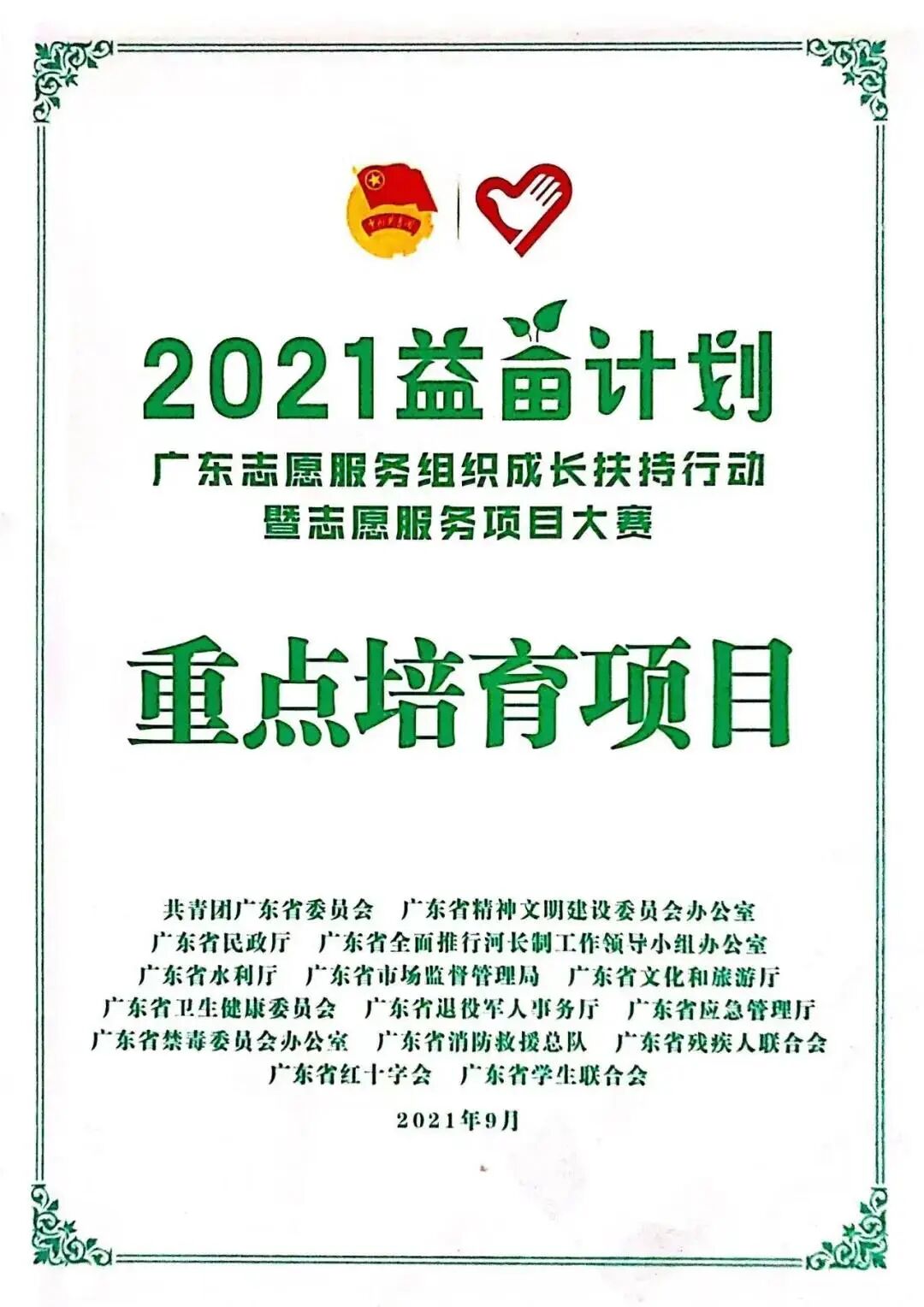 ⑧2021年红十字协会的“救在身边,心暖人间”——大学生应急救援与抗击疫情项目在2021年益苗计划——广东志愿服务组织成长扶持行动暨服务项目大赛中荣获省级重点培育项目;