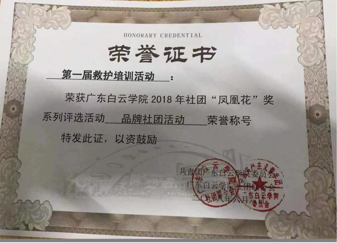 ⑤2018年6月,荣获广东白云学院社团“凤凰花”奖系列评选活动“品牌社团活动“荣誉称号;
