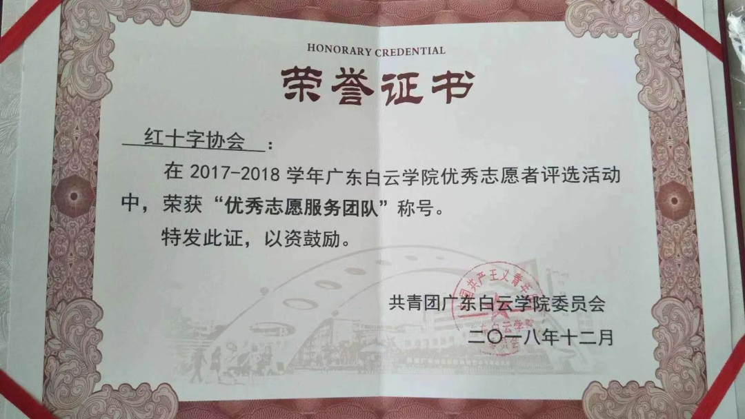 ④2018年5月,荣获广东白云学院“优秀志愿服务队”称号;