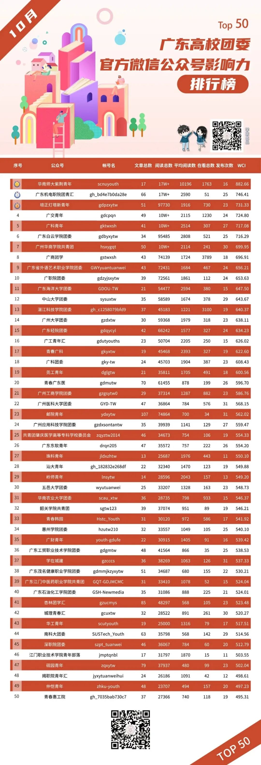 大家好,这里是华南师大学生会,很荣幸能登上10月“广东高校学生会官方微信公众号排行榜”榜首。回望十月,我们共发出12篇推送,平均阅读量5500+,《“华师NBA!”谁是你心中的梦之队》、《这些为同学做实事的项目,行!》两篇推文斩获“1w+”浏览量。我们紧跟时代,砥砺前行,以“华小狮剧场”的形式为祖国庆生;坚定信念,积极引领,及时报道党的二十大精神学习情况;抓准定位,服务师生,开展校园新媒体大赛、趣味投篮大赛等活动,丰富同学文娱生活;抓牢主责主业,服务成长成才,推出大学生“考证攻略”,教师资格证考试攻略。